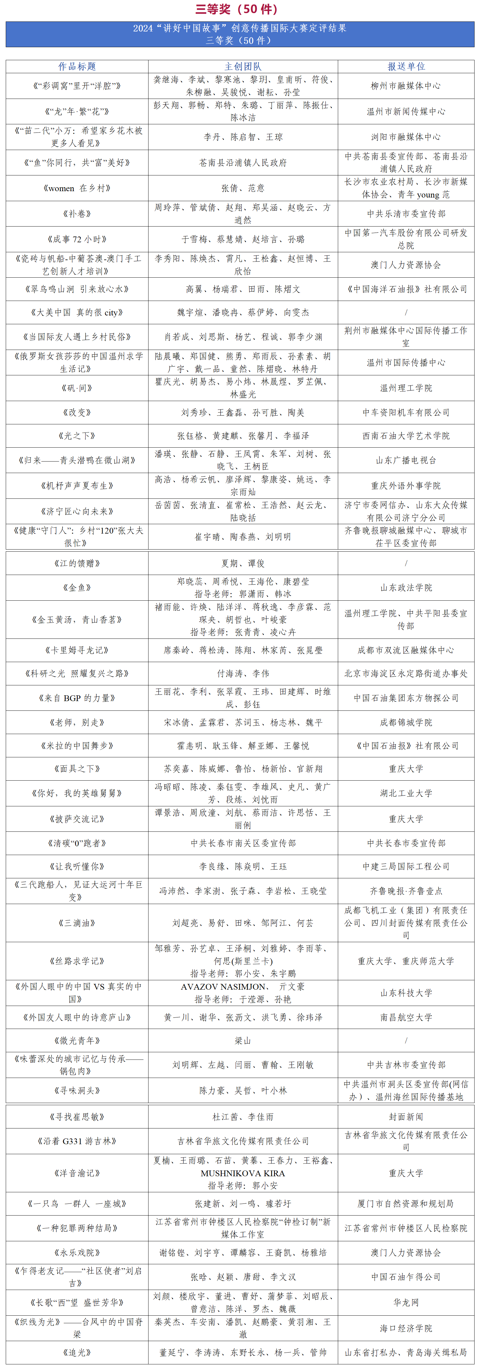 由中国外文局主办的2024“讲好中国故事”创意传播国际大赛定评结果自今日起在中国网、“讲好中国故事创意传播国际大赛”微信公众号、头条号公示。本届大赛拟获奖作品158件,其中特等奖3件、一等奖15件、二等奖30件、三等奖50件、优秀奖60件。