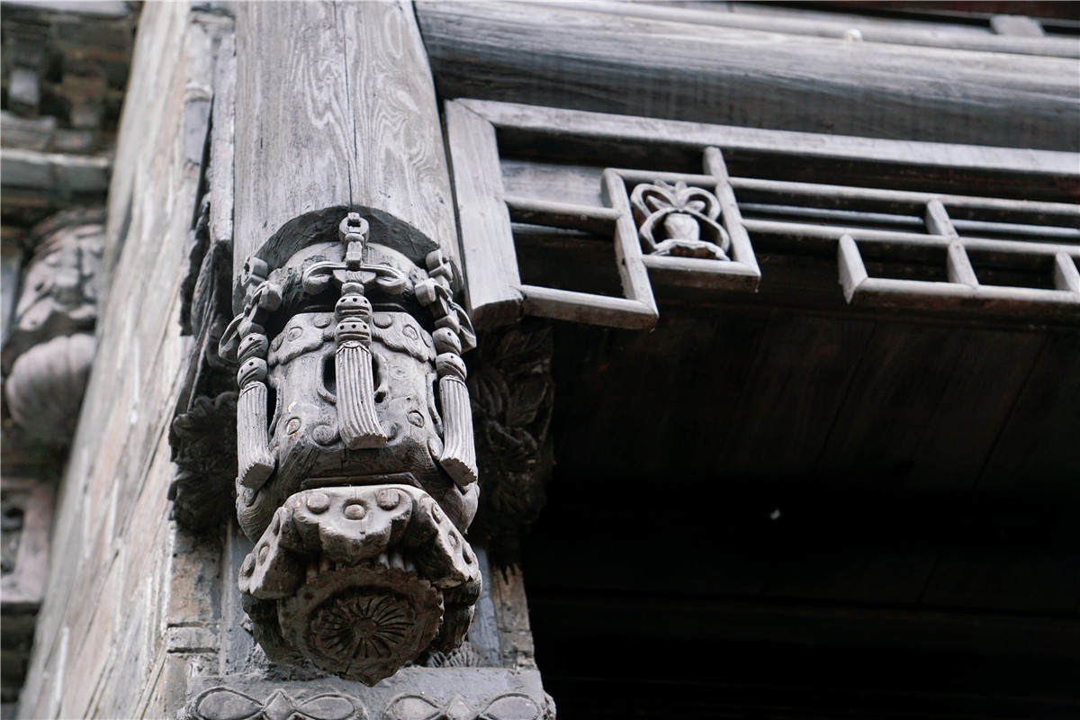 吊瓜柱是穿斗式结构中常见的建筑构件,瓜柱下部悬空,底部也就被雕刻成各种花饰、图案的样子来装点吊脚楼。
