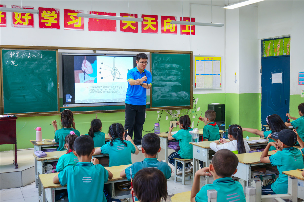 支教老师耐心指导孩子练习硬笔书法。