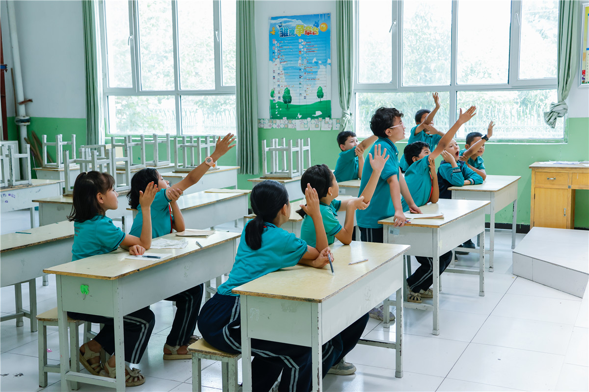 课堂上孩子们积极举手发言,气氛热烈。