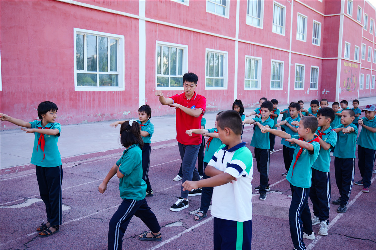 支教老师细心为孩子讲解螳螂拳动作要领。